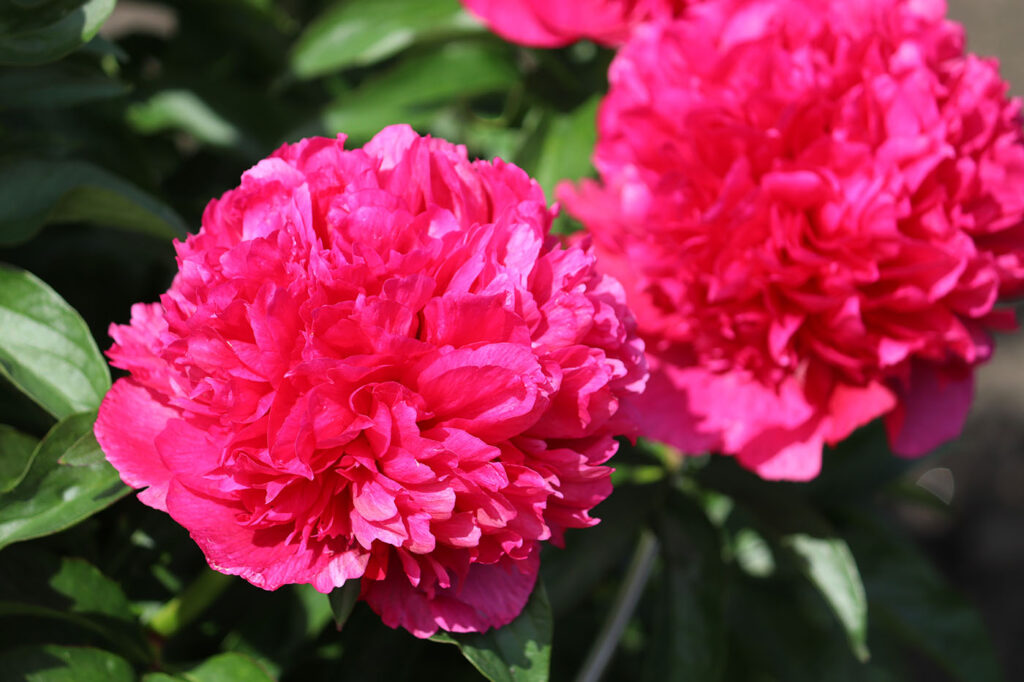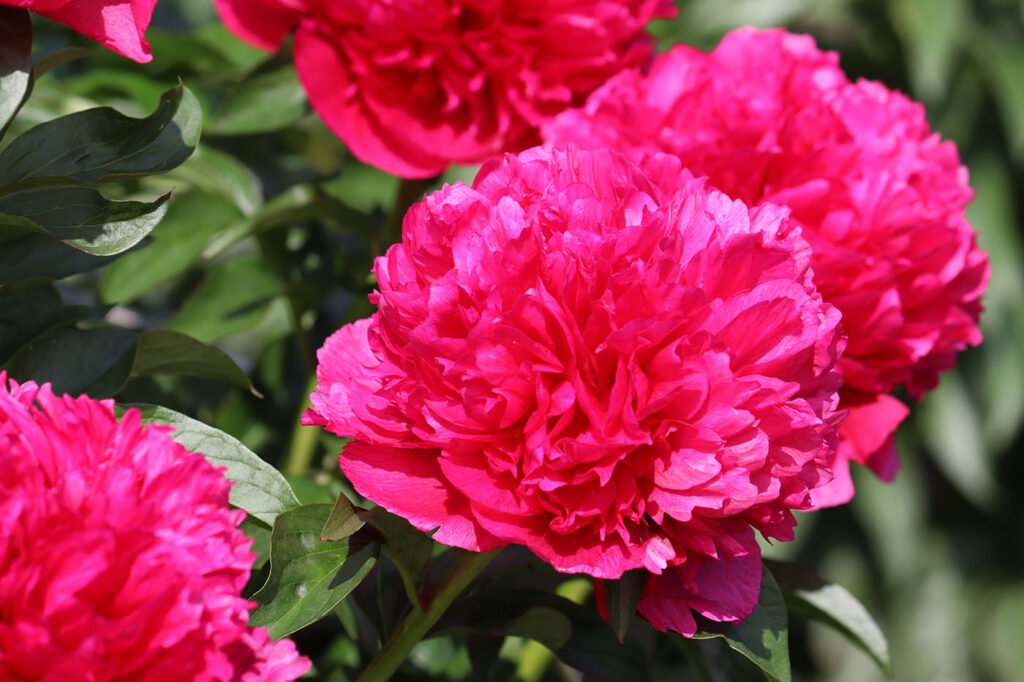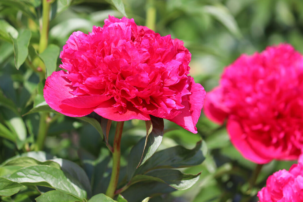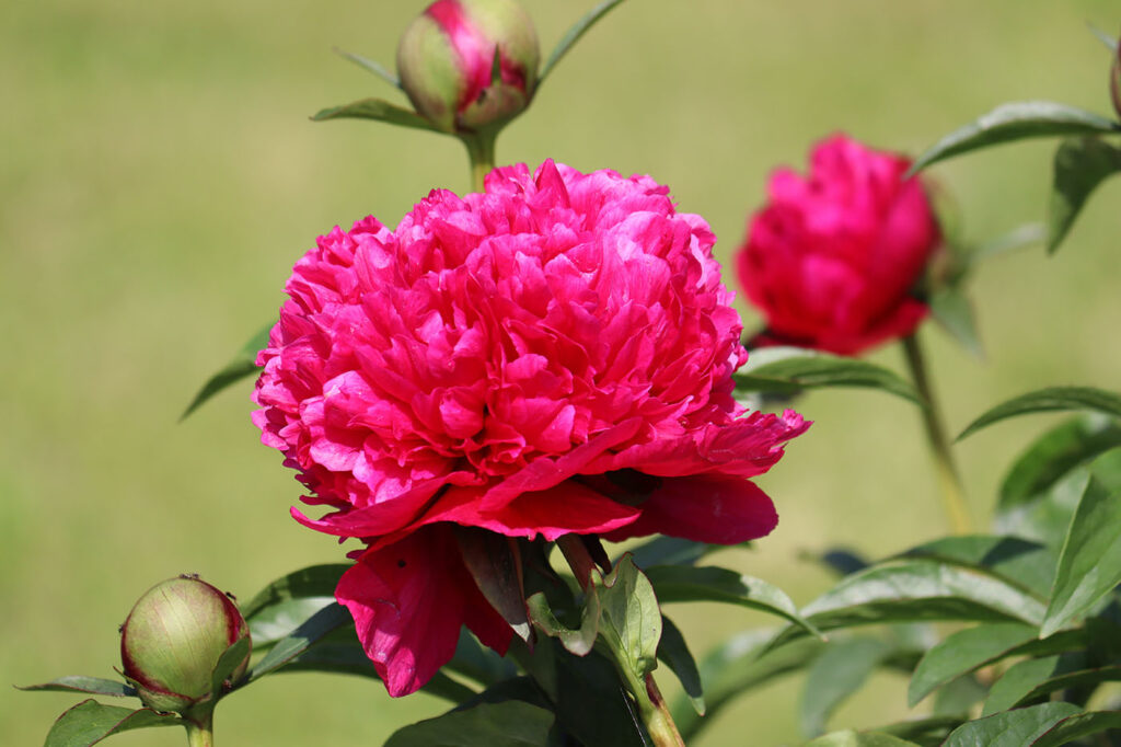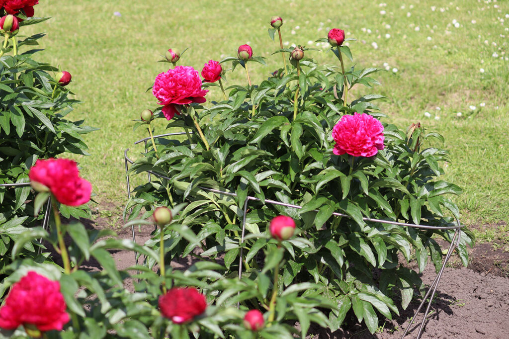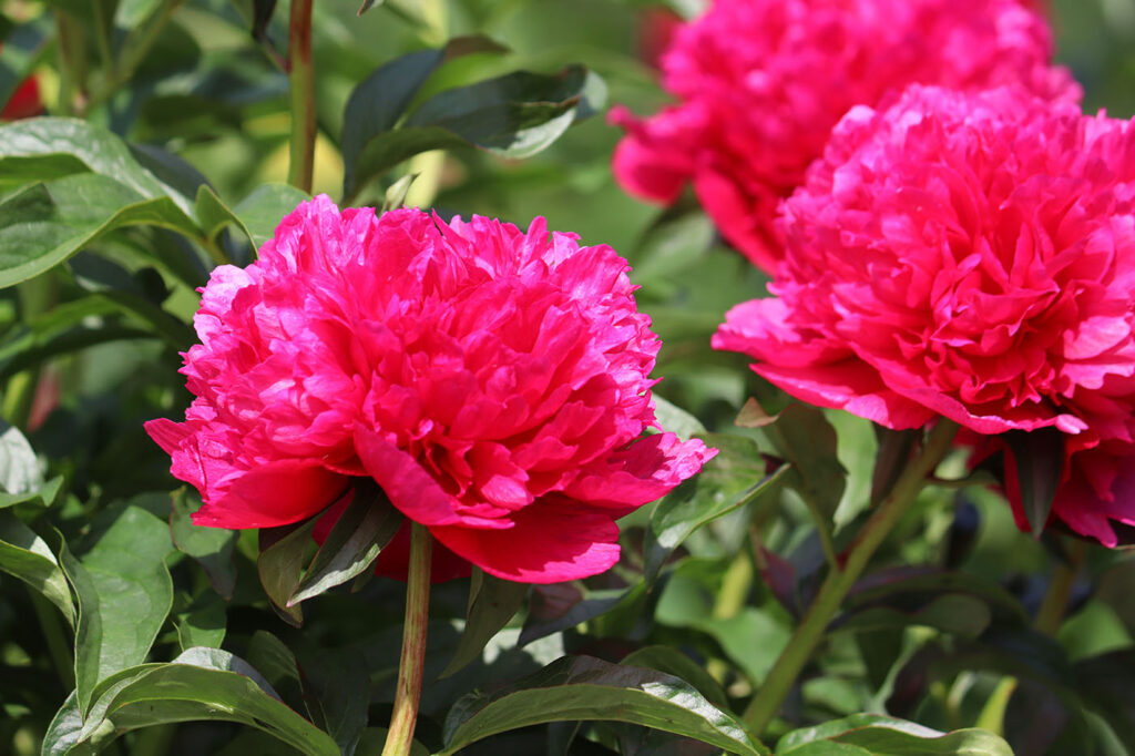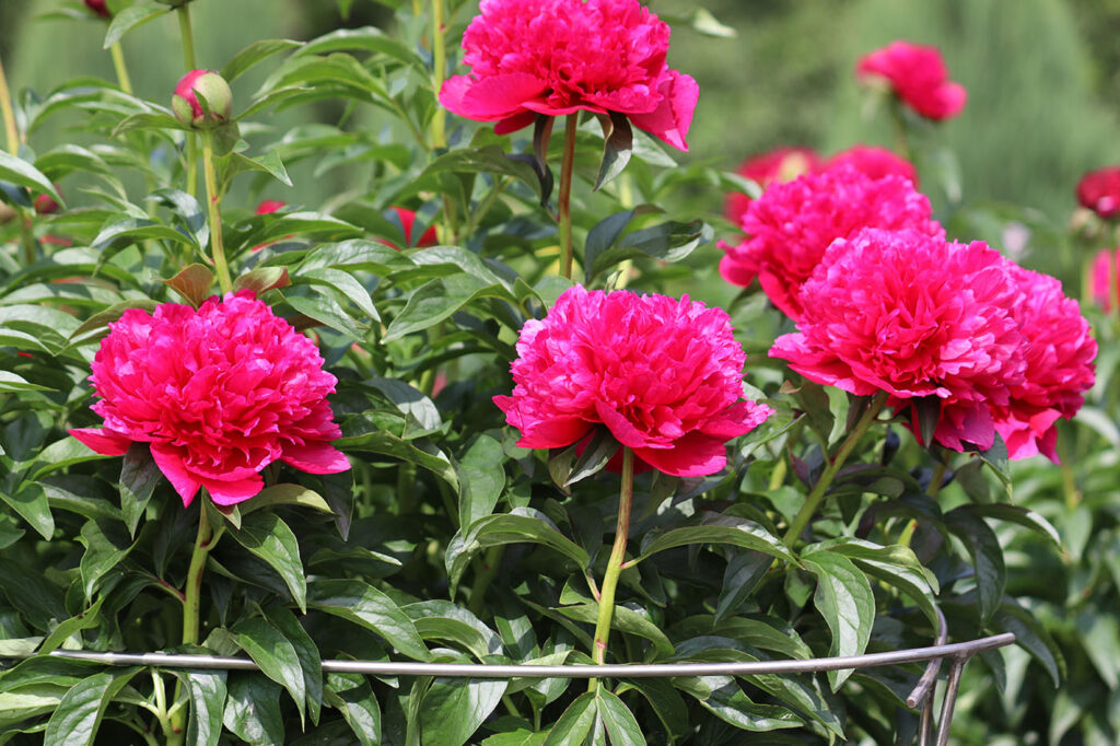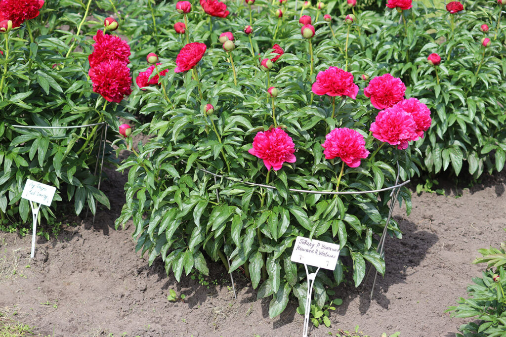 Куст высотой до 90 см. Стебли прочные. Цветы крупные, махровые, шаровидные, диаметром до 17 см. Окраска цветов яркая, насыщенная, красно-рубиновая с лилово-розовыми тонами. Цветы без тычинок. Период цветения: ранний, ранне-средний.